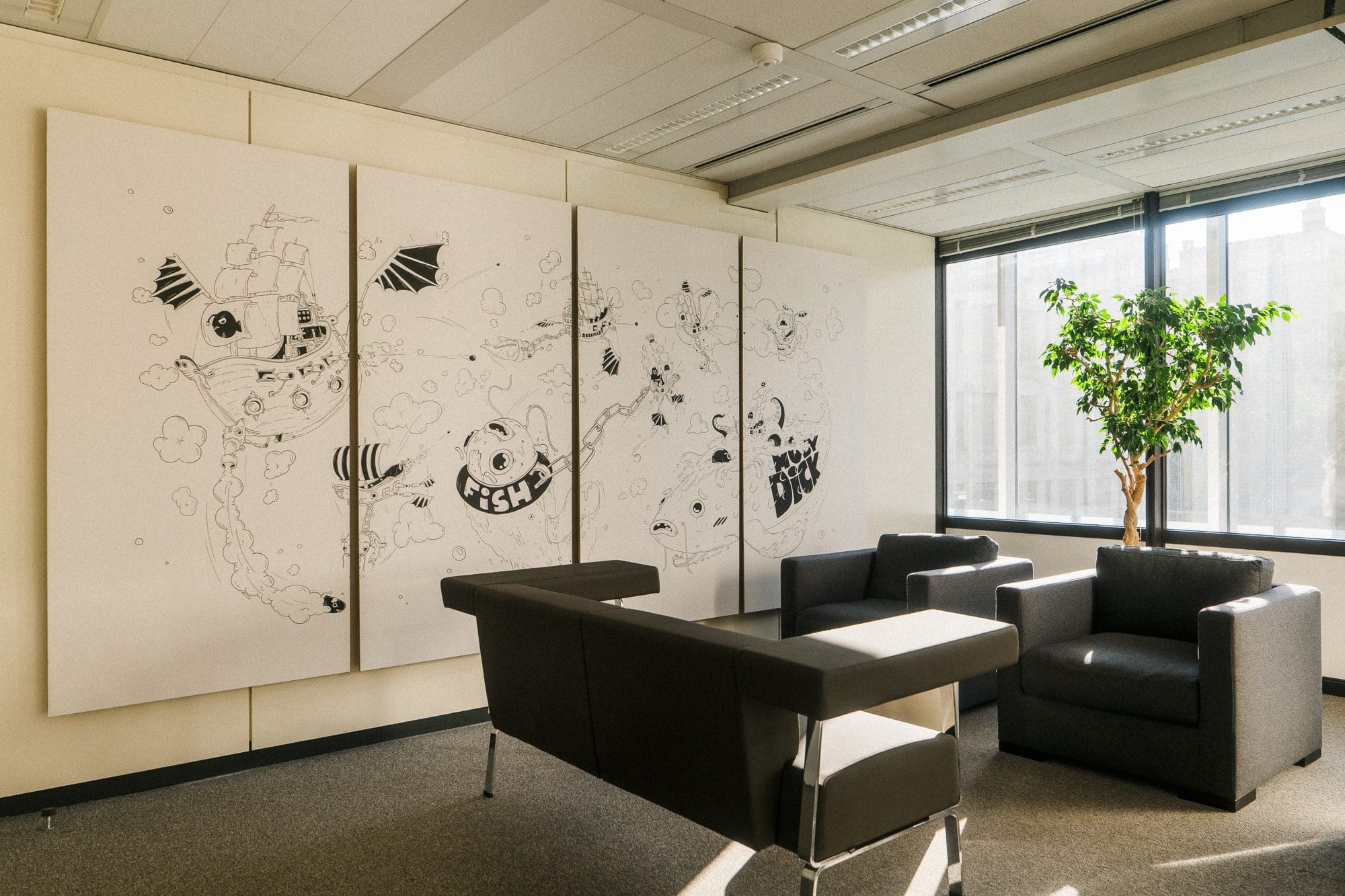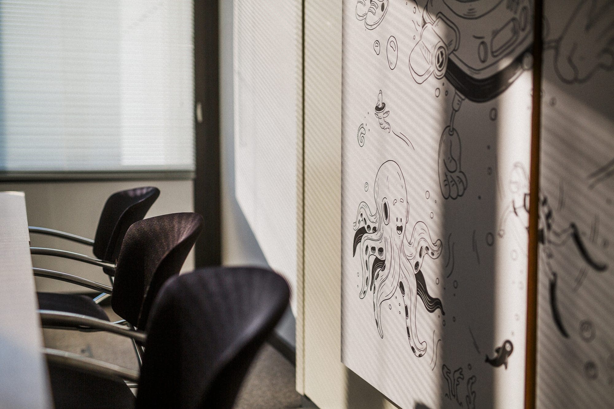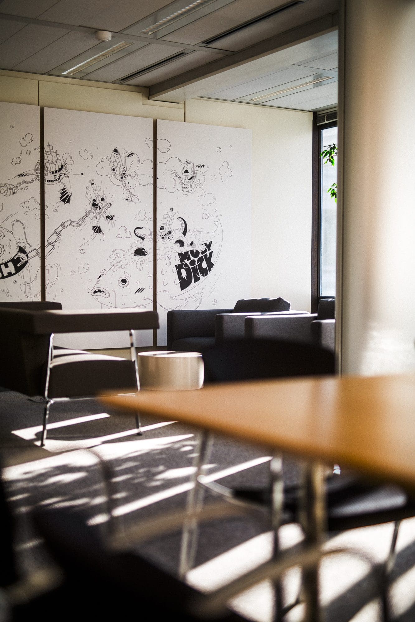 The space is decorated by Kevin Antoine, a Brussels-based director, art director, and illustrator. Known for blending storytelling, motion, and graphic detail, his black-and-white cartoon compositions bring a lively, imaginative touch to the room, transforming it into a space where ideas flow freely.