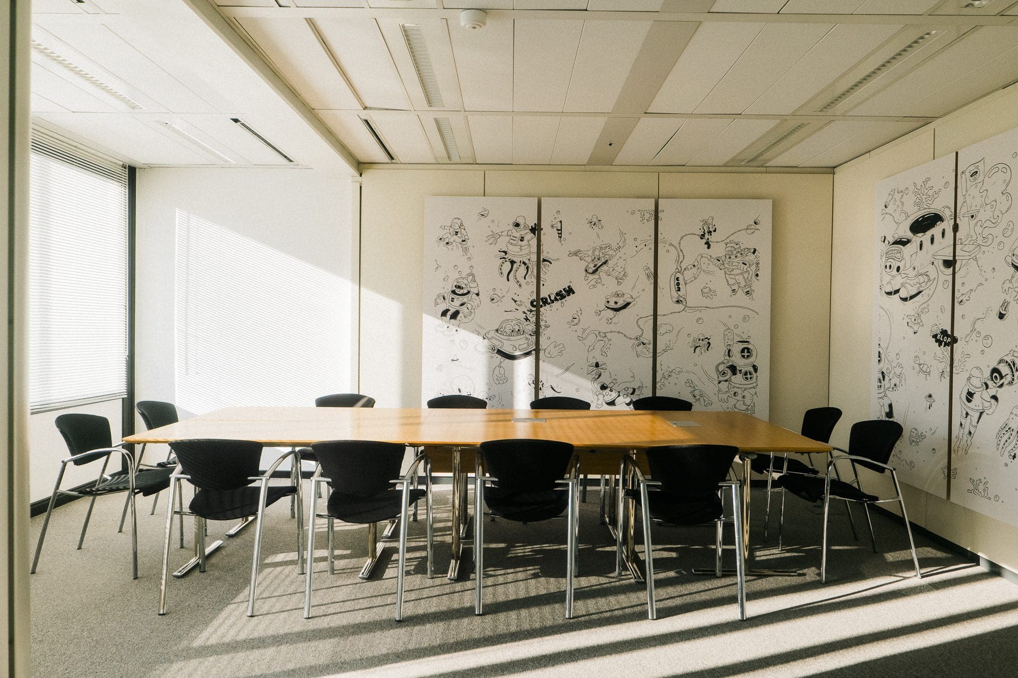 A bright and inspiring room designed for brainstorms, strategy sessions, and creative workshops. Flexible layouts, generous daylight, and playful wall illustrations create an energizing backdrop that sparks focus and collaboration just steps away from the European quarter.